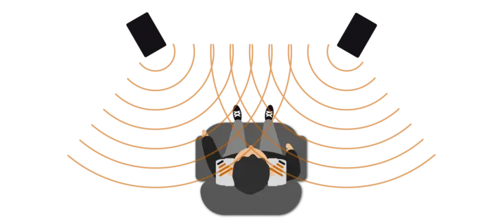 Die Frontseitige Schallfeldmodulation (FSFM) positioniert die Schallwandler im Kopfhörer schräg vor dem Ohr. Er projiziert die Schallwellen so, als kämen sie von einer Quelle, die sich vor uns befindet.